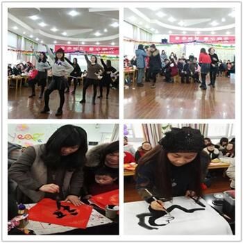 活动在老师们的欢声笑语中拉开帷幕,首先俞昕园长送上了甜甜的新年祝福,肯定了全体教职工这一年来为幼儿园付出的辛勤劳动,同时鼓励大家在新的一年里再接再厉,争取更好的成绩。紧接着丰富多彩的节目和游戏活动把整个联欢会带上了高潮。节目有叹为观止的《舞蹈串烧》,包含了民族舞、有爵士舞、现代舞,还有拉丁舞,向大家展示了青年教师们的朝气蓬勃和青春魅力;有幽默风趣且有现实意义的小品《碰瓷》,教师们把各个角色演绎得淋漓尽致,不时引得台下阵阵掌声;还有真情流露的诗朗诵《我是幼师》,表达了老师们对这个职业的热爱,以及职业所担负的责任等等。与此同时,游戏贯穿始终,每一位教职工积极参与,体验童心同乐的节日氛围。最后,在美妙动听的歌曲串烧《四季送祝福》中拉下了帷幕,行政领导班子成员用写、画、剪等形式送出了新年对联和福字。